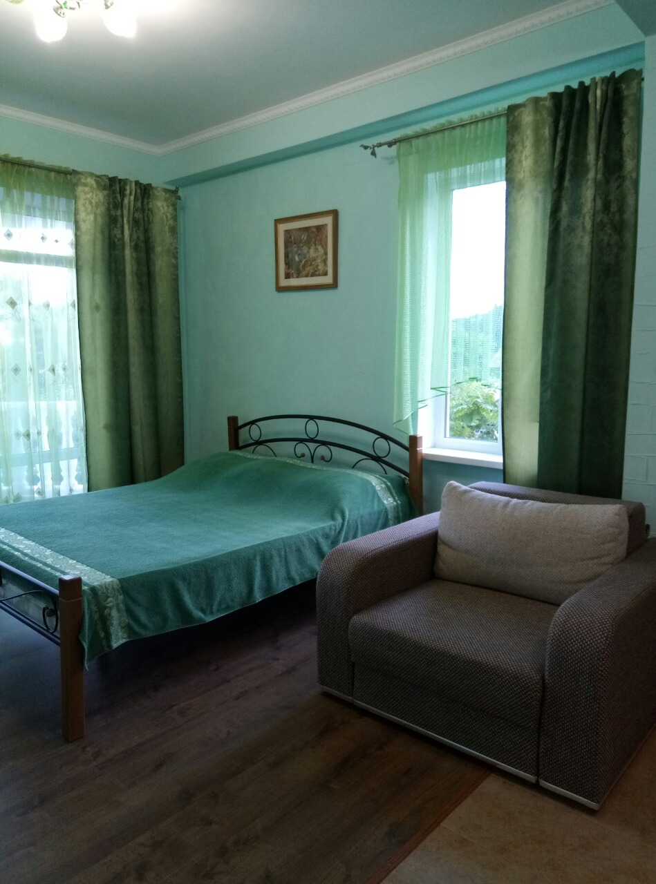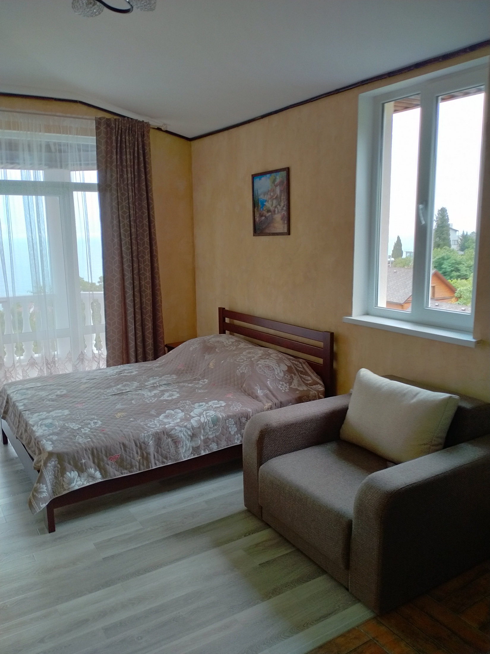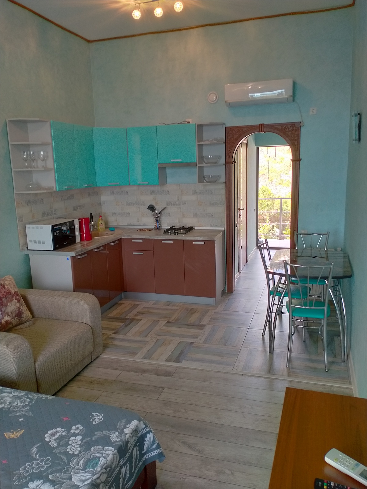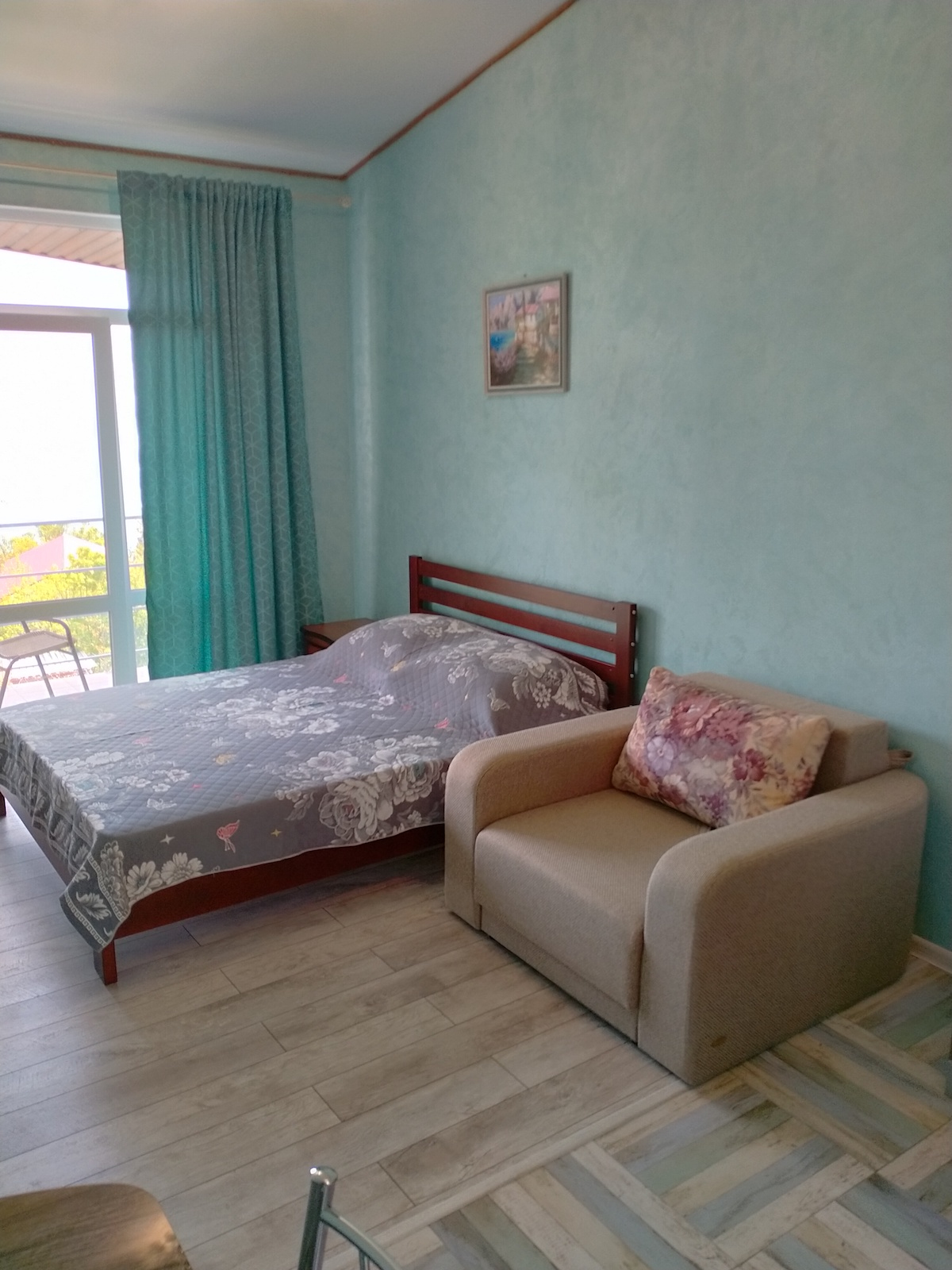 Номера оснащены всем необходимым для отдыха, большая двуспальная кровать и кресло-кровать, есть возможность поставить дополнительное место. ЖК телевизор со множеством каналов не даст заскучать вечером. Кухня в номере имеет казовую плиту, микроволновку, набор посуды, что позволяет готовить изысканные блюда из крымских овощей, фруктов и свежевыловленных морепродуктов.