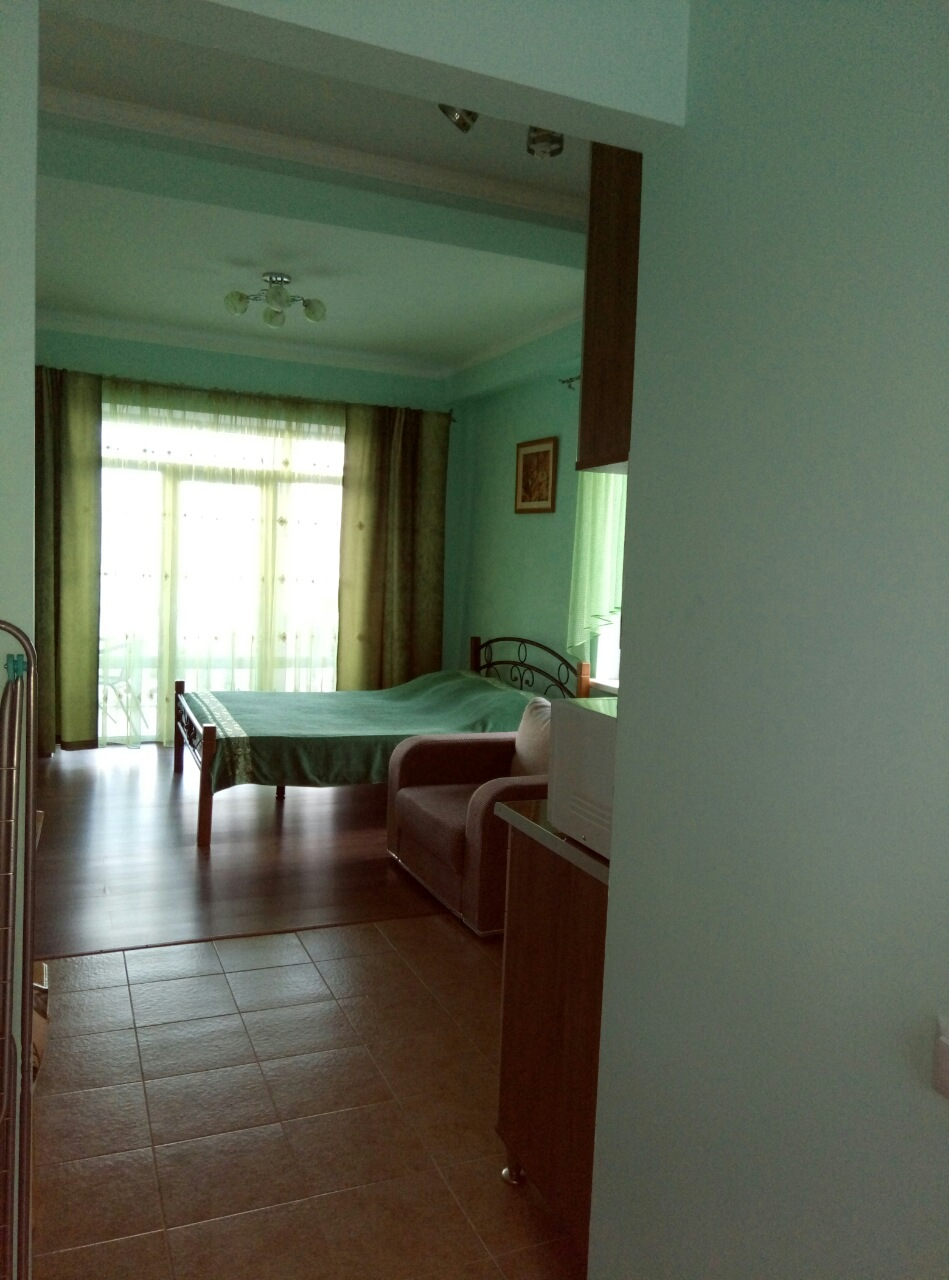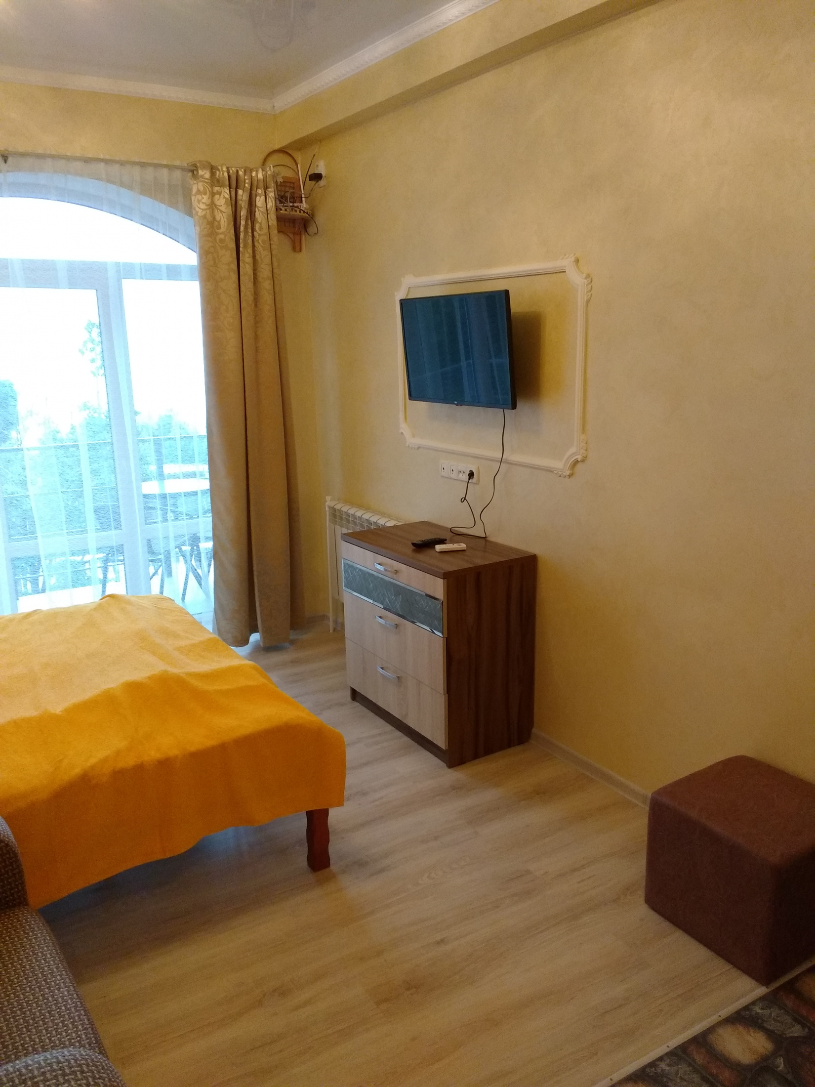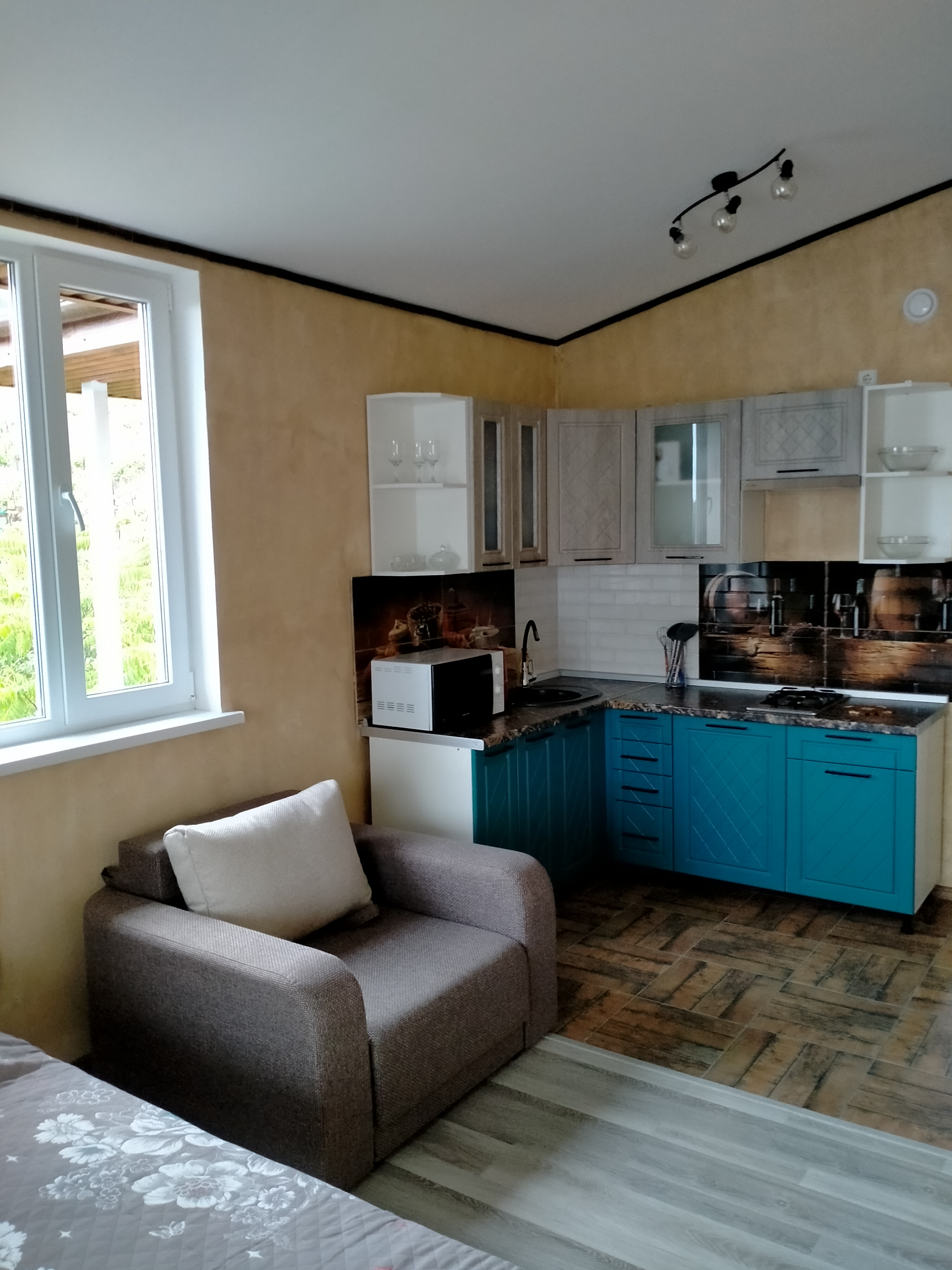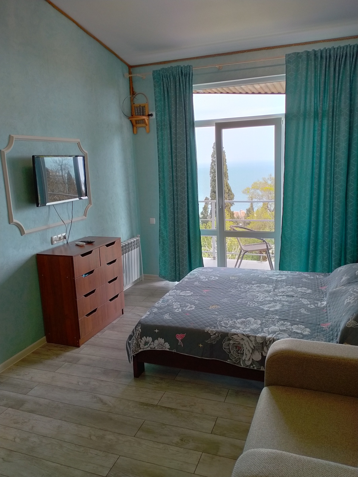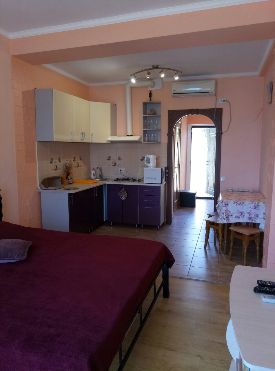 Номера оснащены всем необходимым для отдыха, большая двуспальная кровать и кресло-кровать, есть возможность поставить дополнительное место. ЖК телевизор со множеством каналов не даст заскучать вечером. Кухня в номере имеет казовую плиту, микроволновку, набор посуды, что позволяет готовить изысканные блюда из крымских овощей, фруктов и свежевыловленных морепродуктов.